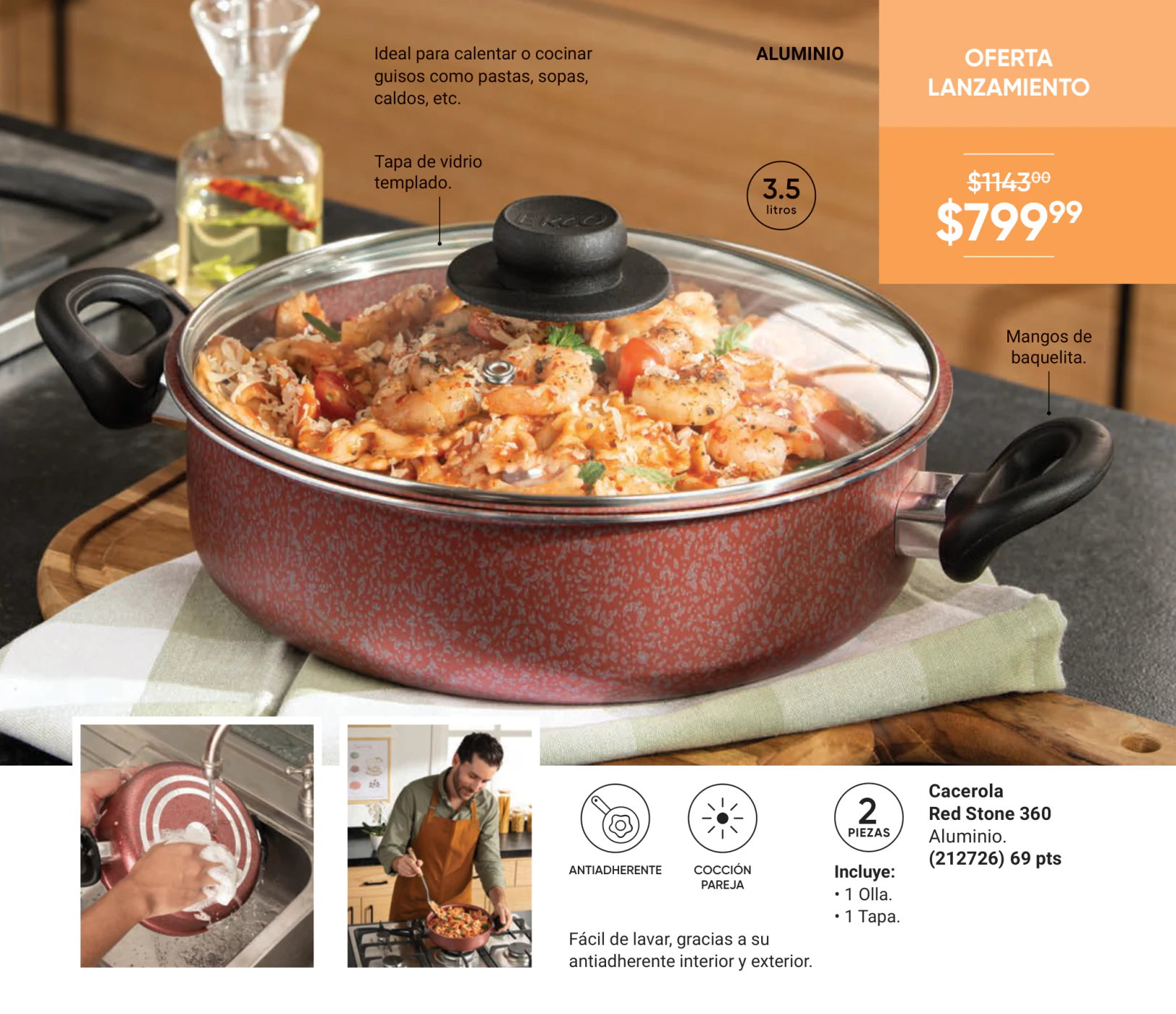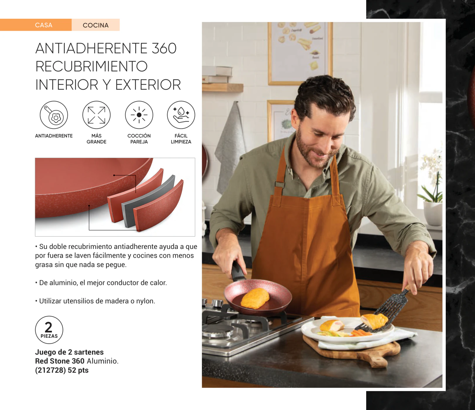 - La nueva colección Red Stone 360 incluye un juego de 2 sartenes y una cacerola con antiadherente interior y exterior. Su material de aluminio asegura una cocción pareja y fácil limpieza.