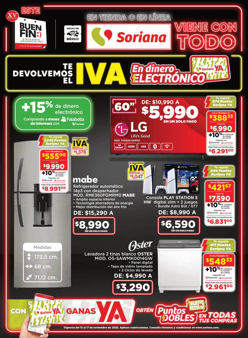 Soriana te devuelve el IVA en dinero electrónico Soriana YA en compras en categorías participantes. El dinero electrónico depositado podrá ser usado a partir del 18 de noviembre de 2025.