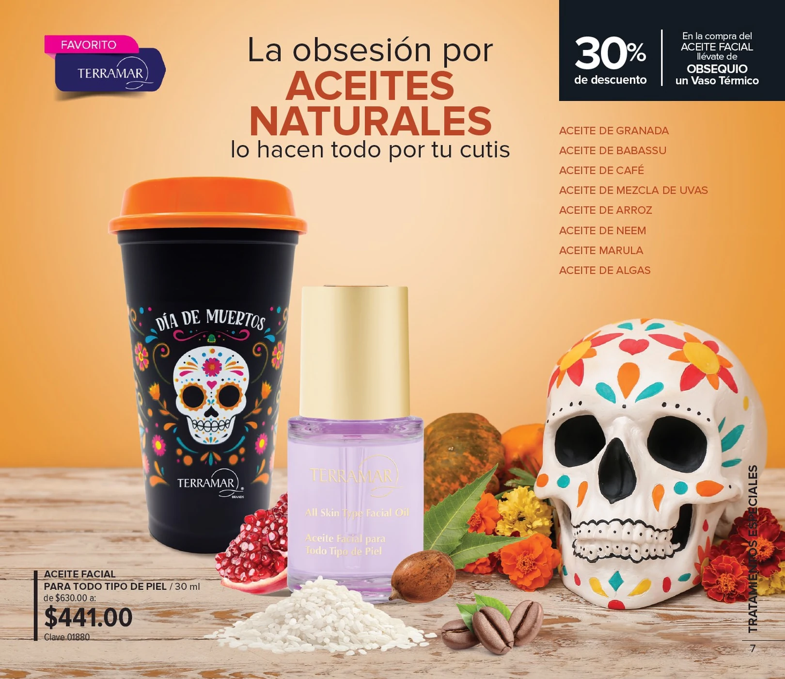 - El Aceite Facial para todo tipo de piel tiene un 30% de descuento e incluye un obsequio de Vaso Térmico. Está formulado con aceites de café, arroz, granada y algas.