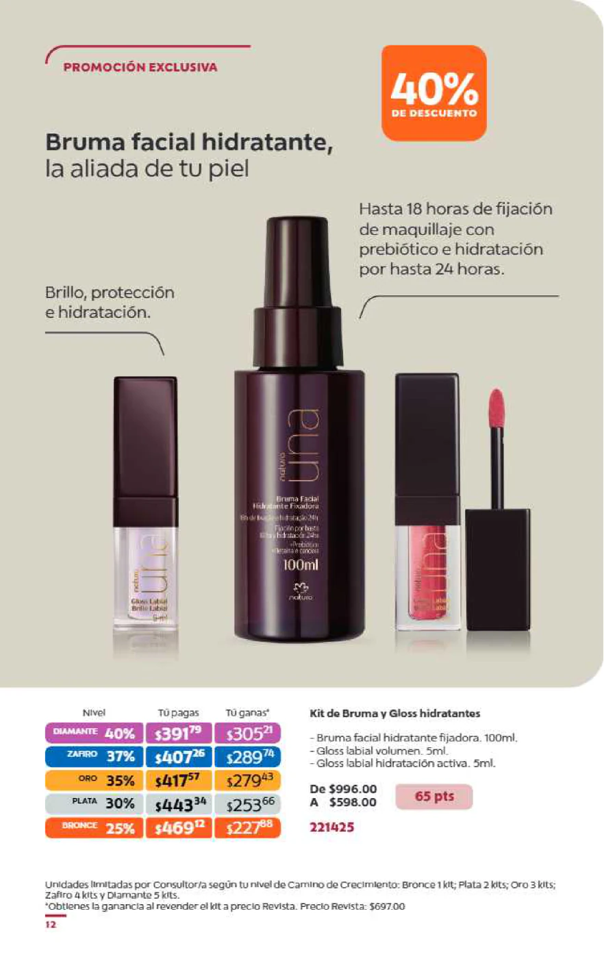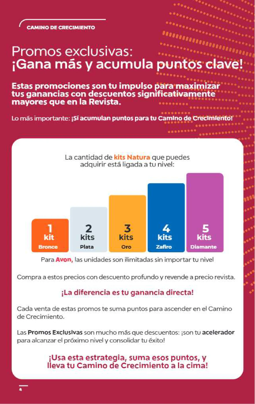 - La cantidad de kits Natura que puedes adquirir está ligada a tu nivel (de Bronce a Diamante), mientras que para Avon las unidades son ilimitadas.