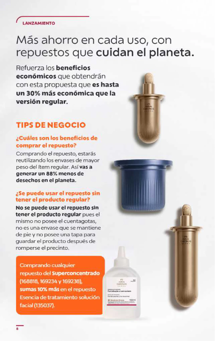 - Natura promueve los repuestos para el cuidado del planeta, siendo hasta un 30% más económicos que la versión regular.