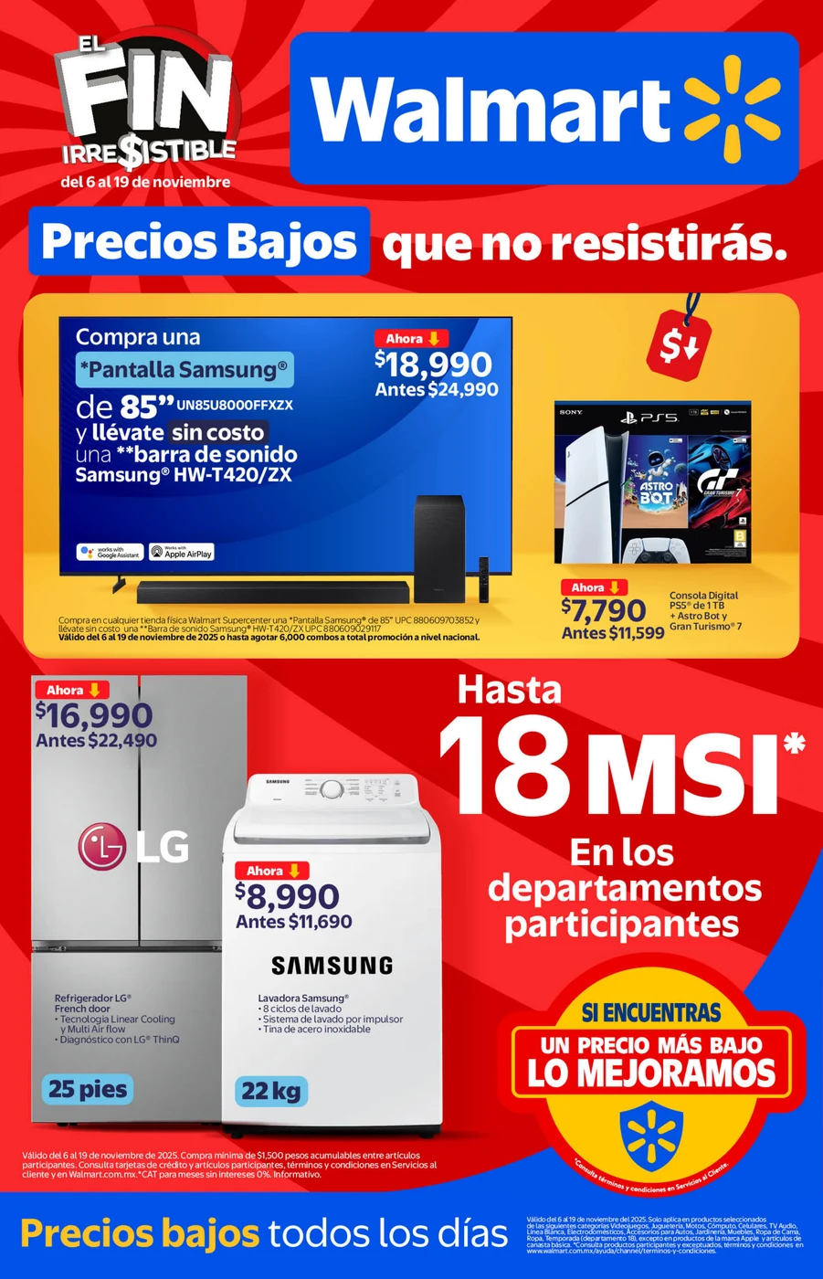 Walmart presenta su flyer de ofertas para El Fin Irresistible de Walmart, ofreciendo a sus clientes la oportunidad de adquirir productos a precios especiales durante el mes de noviembre. Esta campaña es la alternativa de la cadena a otras iniciativas de descuentos, manteniendo su compromiso de ofrecer precios bajos en tiendas fisicas.